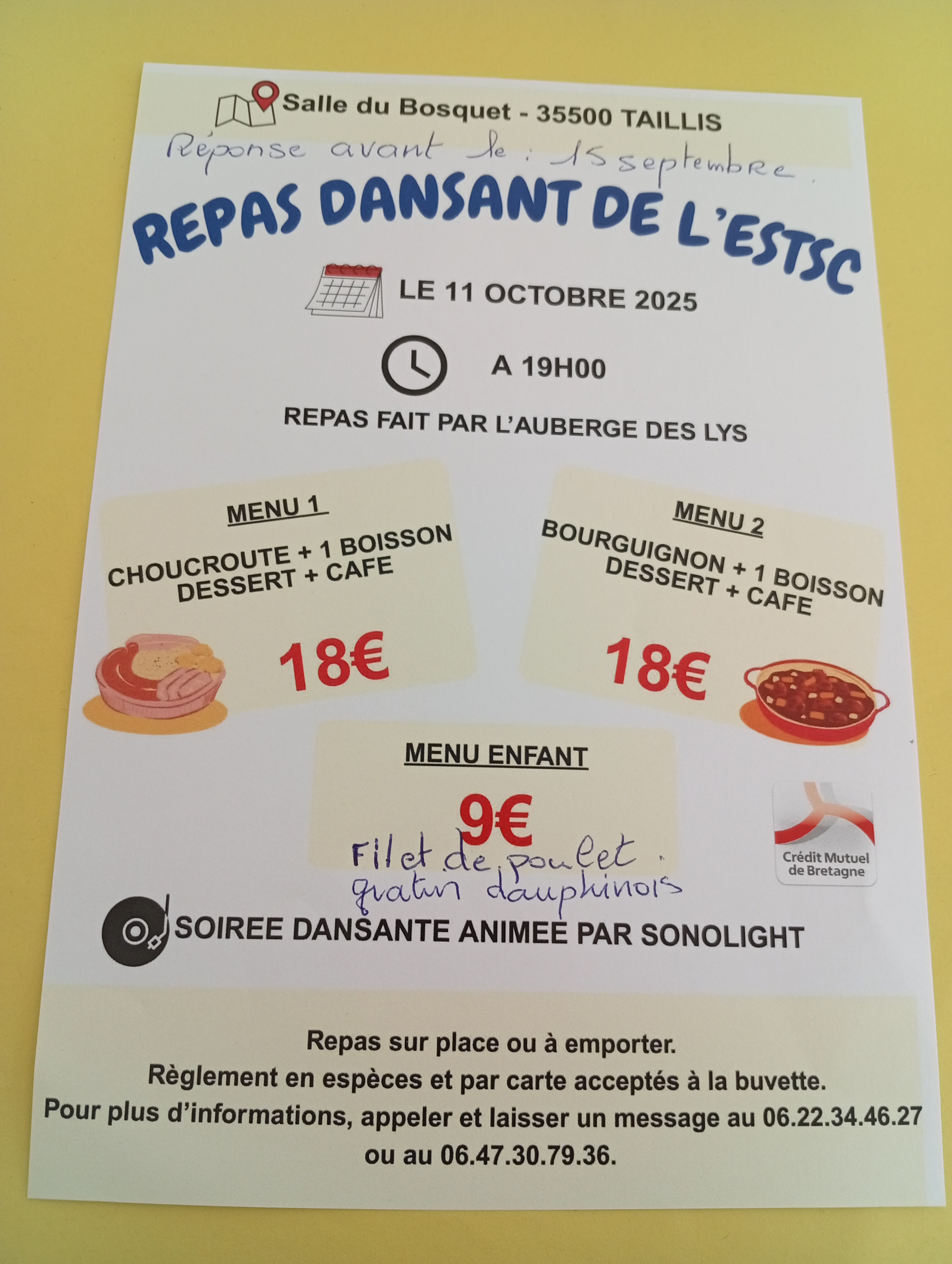 L'ESTSC vous donne rendez-vous le 11 octobre 2025 pour sa choucroute à la salle du bosquet à partir de 19h et 18h pour les plats à emporter.