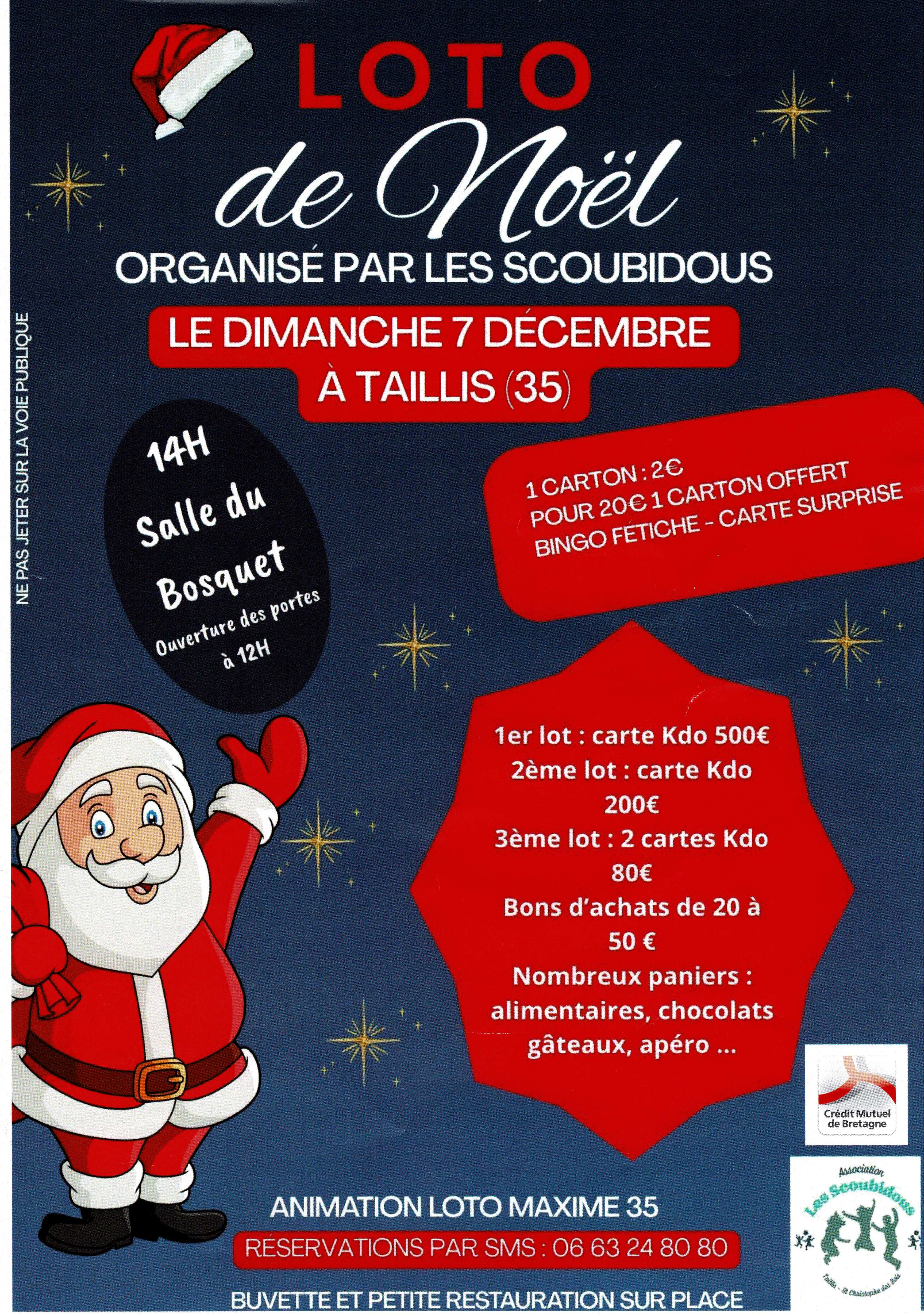 Les scoubidous organisent un loto de Noël animé par Loto Maxime 35 le Dimanche 7 Décembre à 14 h (ouverture des portes à 12 h) à la salle du Bosquet.