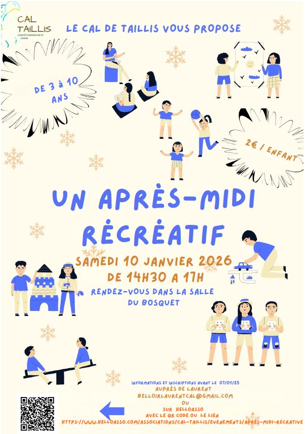 Le CAL organise un après-midi récréatif pour les enfants de 3 à 10 ans, le 10 janvier 2026 à la salle du Bosquet de 14H00 à 17H00.