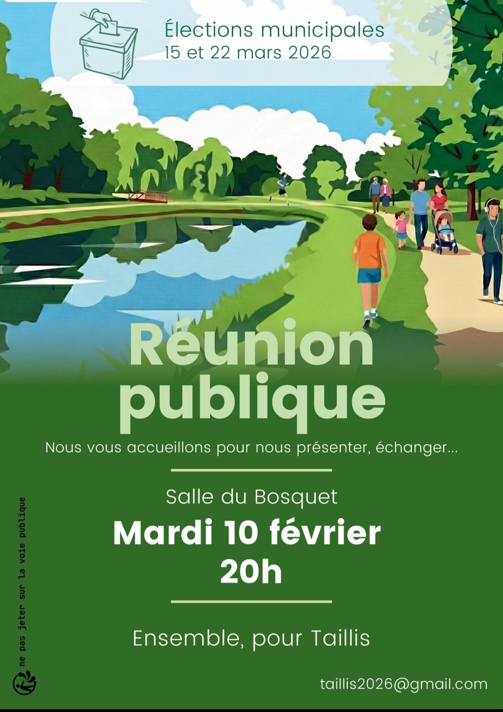 L'équipe de la liste "Ensemble, pour Taillis" vous invite à une réunion publique d'échanges et de présentation. Venez découvrir nos candidats et partager vos idées pour l'avenir de la commune !